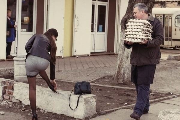 セクシー美女に釘付けのおじさん。大量の卵を抱えていますね!「こんな状況でよそ見するなんてありえない!」女性の方ならそう思うかもしれません!