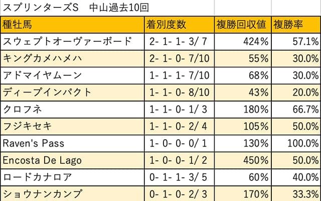 ロードカナロア産駒は[0-1-1-3]。2度の好走例はどちらもダノンスマッシュ(19年3着、20年2着)によるもの。ロードカナロア自身は12・13年と2連覇を果たしているだけに、いつ父子制覇となっても不思議はないだろう。今年は3度目の出走となるダノンスマッシュほか、ファストフォース、ロードアクア、ボンボヤージ(除外対象)が特別登録している。
