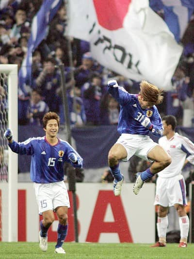 北朝鮮で会心の一撃を放ち、歓喜のガッツポーズを決める大黒将志(右)