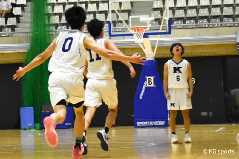 <写真・逆転の3点シュートを決め、祝福を受ける山際> 10月2日、向日市民体育館にて2021年度関西学生バスケットボール…