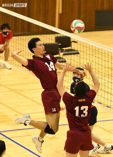2セット目はセッターの佐藤玲(社3=東京・早実)、ミドルブロッカーの伊藤吏玖(スポ2=東京・駿台学園)が起用され、2、3年生中心のメンバーとなった。伊藤のクイックやブロック、水町のサービスエース、重藤トビアス赳(スポ3=神奈川・荏田)のスパイクなどで5連続得点し、その後もリードを保つ。サーブで崩して攻撃の選択肢を減らし、守備を固めた。そこからクイックやバックアタックなどの多彩な攻撃を展開。25-21と盤石な試合運びでこのセットを取り返した。3セット目も同様に序盤から連続得点し、主導権を握る。セットポイントの場面、スパイカーが本来とは違うポジションから攻撃する『S1ローテ』で3連続得点されるも、最後は水町のスパイクで25-20とした。