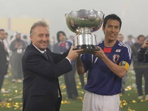 2011年、アジア杯に優勝し長谷部誠とトロフィーを手にしたアルベルト・ザッケローニ photo by Fujita Masato