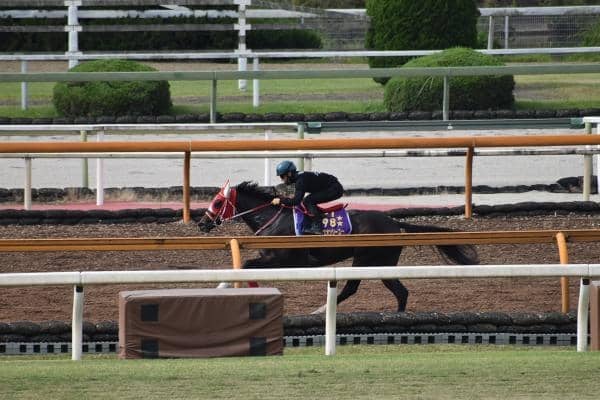 11月6日(土)にデルマー競馬場、芝2200mで行われるBCフィリー&メアターフへの出走を予定しているラヴズオンリーユー(栗東・矢作芳人厩舎)。今朝6日はレースに向けた追い切りを行っている。