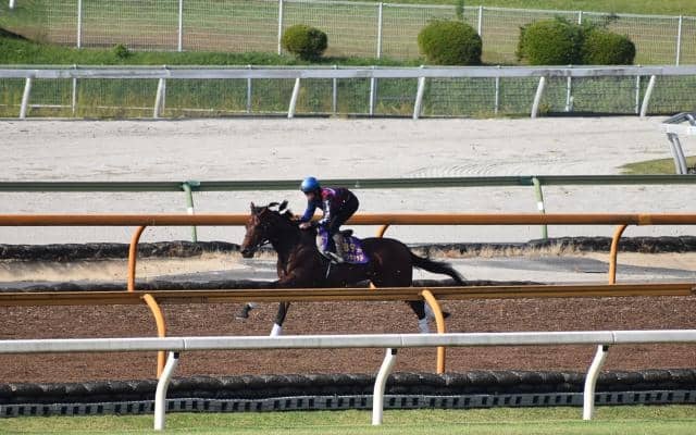 今朝6日はレースに向けた2週前追い切り。2回目のハローが終了した直後のCWコースへ、斎藤新騎手を背に入場。先頭がクラシックステップ、続いてモンゴリアンキングという隊列の一番後ろで、向正面に入ったあたりでは、先頭と3秒近い差があったように見えた。