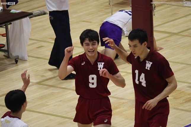 早大は前日の駒沢大戦からスタートのメンバ―を変更し、セッターの佐藤玲(社3=東京・早実)とミドルブロッカーの伊藤吏玖(スポ2=東京・駿台学園)がコートに入った。序盤からサイドを中心に攻撃を組み立て、着実に得点を重ねる。秋季リーグ戦からオポジットにポジションを変更した重藤トビアス赳(スポ3=神奈川・荏田)の強烈なスパイクを皮切りに3連続得点し、12-7と点差を広げた。タイムアウトを挟んで後半に入ると、重藤、大塚達宣(スポ3=京都・洛南)のスパイクや伊藤の好守備もあって4連続得点する。点差を19-10として一気に相手を引き離した。その後はサイドアウト(※1)を取り合うかたちとなり、最後は水町泰杜(スポ2=熊本・鎮西)がエンドラインぎりぎりのノータッチエースを決め25-17に。上々のスタートを切った。