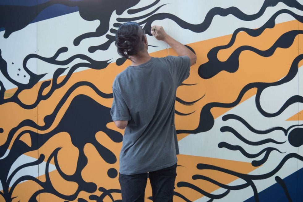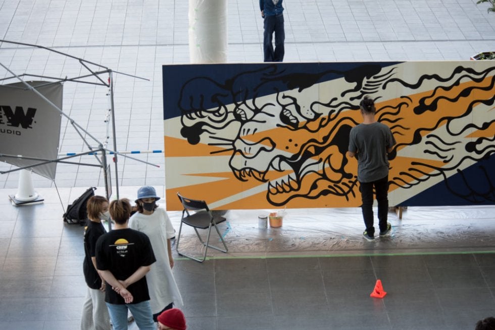 セッションライブペイントにて出来上がった圧巻の作品は、福井駅前のメインスポットにて「ストリートアート」としての輝きを放った。ストリートな空間のシンボルとして、作品の前で多くの人がカメラを構えて写真撮影を行っている姿も伺えた。
