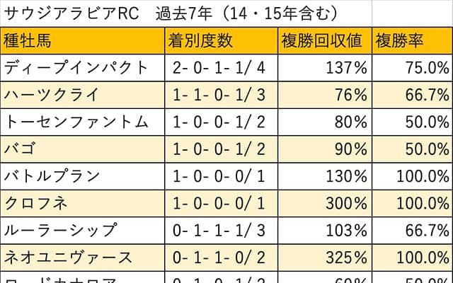9日に東京競馬場で行われるサウジアラビアRC(2歳・GIII・芝1600m)について血統・種牡馬別に検証していく。なお、いちょうS(新設重賞)、サウジアラビアRC(重賞)として行われた14・15年もデータの集計対象とした。