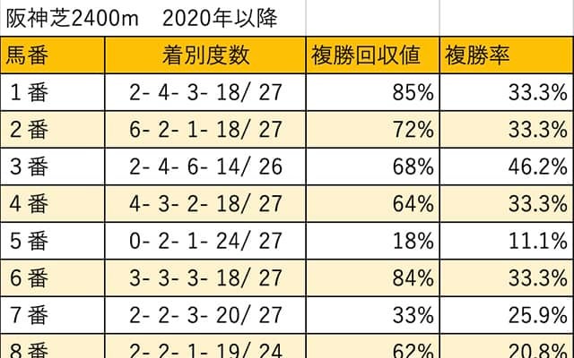 10日に阪神競馬場で行われる京都大賞典(3歳上・GII・芝2400m)について枠順・馬番別に検証していく。なお、今年は開催日割の変更に伴い阪神芝2400mにて施行されるため、2020年以降の当該コース成績をデータの集計対象とした。