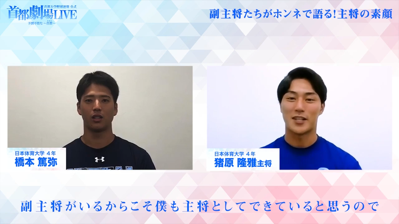 9月11日(土)に開幕した首都大学野球秋季リーグ戦。春季リーグ戦では桜美林大学が9シーズンぶり2度目の優勝を飾った。近年は実力が拮抗し白熱した展開をみせる“首都劇場”で今季はどんなドラマが見られるのか。今回は1部リーグ6大学の主将たちが集結し、初の試みとなるオンライン座談会を敢行。今回は副主将が主将に内緒で収録したメッセージ動画を大公開!!まさかのメッセージによって出た主将たちの“素顔”に注目!