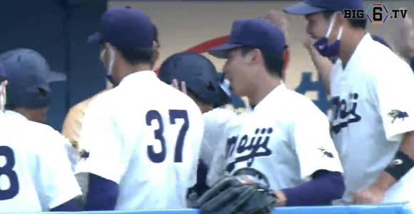 先制は明大。1回表1死2,3塁のチャンスに4番上田(②愛産大三河)のセカンドゴロの間に1点を先制。なおもチャンスに5番山田陸(③桐光学園)にレフト前タイムリーが飛び出す。