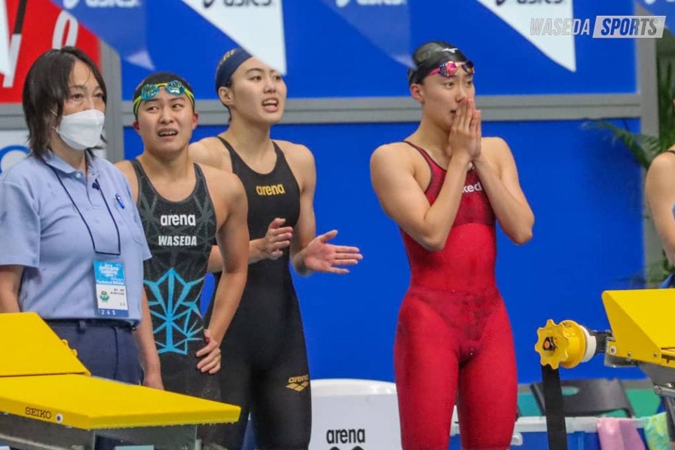 4×100メドレーリレーの最初に行われたのは女子。第一泳者はレース1時間前に200メートル個人メドレーで優勝した松本。この日4レース目の疲れが出たか、先頭からは遅れをとり5位。引き継いだ浅羽栞(スポ3=東京・八王子学園八王子)は6位となったが、第3泳者・牧野が後半から驚異的な追い上げを見せ、順位を一気に2位まで引き上げた。上位5校がほぼ横並びで引き継いだ今牧まりあ(スポ2=長野・飯田)は、激しい優勝争いからやや遅れをとり、最後は5位でゴールした。