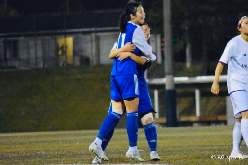 <写真・1点差に迫るゴールを決め、チームメイトに祝福される岡若> 10月9日、同志社大学にて2021年度関西学生女子サッ…