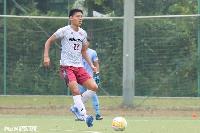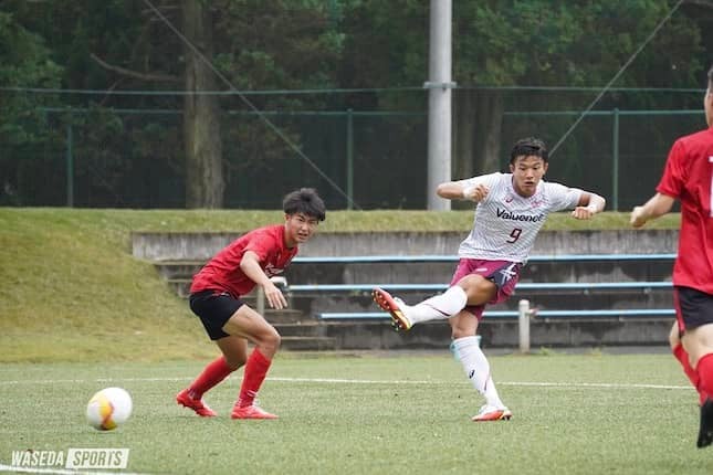 早大は、空中戦から優位を作る駒大対策として、192cmの大型センターバック神橋良汰(スポ1=川崎フロンターレU18)を先発起用した。立ち上がりからロングフィードで圧力をかけられるなか、神橋のブロックやGK上川琢(スポ4=湘南ベルマーレU18)の勇気を持った飛び出しでゴールを守る。一方、早大はボールを保持し、動かす時間が徐々に増えるなか、18分にビッグチャンスが訪れる。MF西堂久俊(スポ3=千葉・市立船橋)が中央から受けたパスをワンタッチで相手と入れ替わり左サイドを突破。そこから早めに上げたクロスをFW奥田陽琉(スポ2=柏レイソルU18)がコントロール。ブロックしに来た相手DFも冷静にかわし左足シュートを放つが、これはゴール右にわずかに外れる。38分には、MF倉持快(人4=神奈川・桐光学園)がカットインし、その落としを西堂が右足でシュートするも、相手DFに当たり枠を外れる。40分にも、MF山下雄大(スポ3=柏レイソルU18)からの縦パスを奥田が落とし、田中主将がシュートを放つもゴール左へ。なかなかゴールを奪えないなか、43分、駒大右サイドからのFKを土信田悠生(駒大・4年)に押し込まれ、与えたくない先制点を献上。このまま前半を0-1で折り返す。
