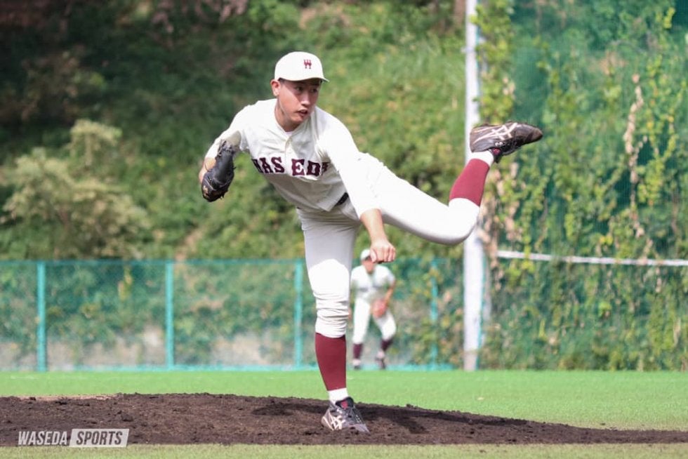 早大の先発は前回登板で好投した田中爽稀(法4=神奈川・柏陽)。田中爽は初回、2本の内野安打などで無死一、三塁のピンチを招くも、後続打者を打ち取り、先制点を許さない。すると3回表、2死から2番・須能副将が右翼方向へ完璧な一発を放ち先制に成功した。だが、直後の3回裏、先頭打者にバントヒットを許すと、後続打者の内野安打に守備の乱れが重なるなどし、2死一、三塁のピンチを招く。この場面で打ち取ったかに思われた相手4番の打球は三遊間へ。遊撃手・渡部椋雅主将(商4=神奈川・桐光学園)が好守を見せるも及ばず、内野安打となり同点とされた。すると、続く5番打者には右中間への適時打を放たれ、勝ち越しを許した。不運な形での失点となった田中爽は、3回2失点でマウンドを降りた。