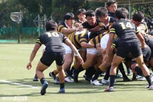 前半6分、敵陣10メートル付近でのラインアウトからモールを形成すると、フッカー原田衛が左に展開し、フランカー髙武俊輔がゲイン。そのまま原田、ロック今野勇久がボールをつないで早くも先制点を決める。12分には鋭いタックルで青学大のノットリリースザボールを誘うと、獲得したペナルティゴールはゴールポストに弾かれて失敗したものの、弾かれたボールに素早く対応してアタックを継続。SO中楠一期のロングパスが左端のWTBアイザイア・マプスアにわたり、2本目となるトライを決めた。さらに16分、19分、29分には、マイボールラインアウトからじりじりとゴールラインへ前進し、3連続でモールトライを成功させる。34分には青学大のラインアウトモールで相手にペナルティを与えるなど、前半はFWがモールの好調ぶりを見せつけた。しかし32分、青学大のキックオフボールにうまく対応しきれず、自陣22メートルのスクラムから隙を突かれ、相手にトライを献上。38分には慶大のノットロールアウェイからクイックスタートで中央にトライを許し、33ー14で前半を折り返した。