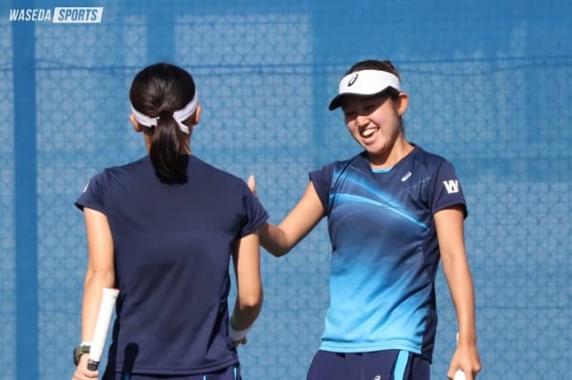 ダブルスは前回と変わらない布陣で試合に入った。D1の前田優歩(社3=沖縄尚学)・吉岡希紗(スポ3=三重・四日市商)組は、昨年の全日本学生選手権(インカレ)優勝ペアである阿部宏美・川出莉子組と対戦。試合は序盤から相手ペアのペースに。川出の素早い前衛の動きに苦しみ、ボレー、スマッシュともに高い技術力を見せる川出に次々とポイントを決められた。さらには阿部の威力のあるサーブやストロークにも苦戦し、第1セットを0-6で落とす。雨での中断を挟み、第2セットはボレーを決めにいき、反撃を見せたゲームもあった。しかし第1セットからの流れは変えられず、ストレート負けを喫した。D2の石川琴実(社3=神奈川・白鵬女)・神鳥舞(スポ2=東京・早実)組は雨での中断の後、3-3から2ゲームを連取。そのまま第1セットを獲得する。しかし、第2セットの中盤で前田・吉岡組が敗れ、勢いに乗った筑波大ペアにミスなく積極的に攻められ、このセットを落としてしまう。ここで敗れてしまうと苦しい展開となる中、第3セットは先にリードを許したが最大3点差以内で粘り強くついていく。そして5-7から石川の相手前衛の横を抜くショットなど、ミスを恐れない積極的なプレーで5ポイントを連取して逆転。チームを鼓舞する勝利で早大は勝敗をタイに戻した。
