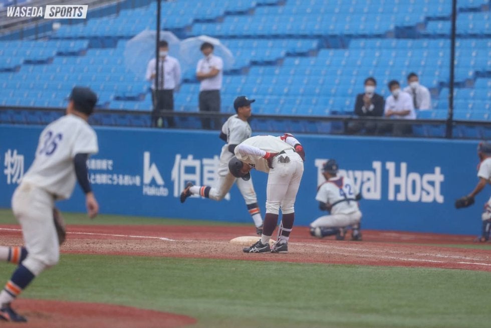 ようやく6回に徳山、7回に.000に安打が生まれたものの、得点に結びつかない苦しい展開が続く。すると、その裏死球と暴投で1死三塁のピンチを招く。しかし.000が三遊間への遊ゴロを落ち着いて処理し、三塁走者を封殺。得点を許さなかった。均衡を破りたい打線は8回、先頭の.000と.000の左前打で好機を演出する。ここで打席に立つのは徳山の代打・小野元気(人4=千葉・芝浦工大柏)。しかし縦の変化球にバットが空を切り、三振を喫する。次打者の鈴木萌斗(スポ4=栃木・作新学院)が四球でつなぐも、中川卓は初球を打ち上げ三邪飛に。9回も7球で三者凡退に終わり、この日は三浦から1点も奪うことができなかった。一方、徳山の後を継いだ.000と.000は終盤の2イニングを、走者を出しながらも無失点で切り抜け、責任を果たした。