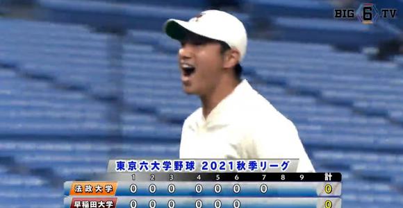 9回、法大のマウンドには1年生右腕・篠木(①木更津総合)が立つ。その篠木は最速152km/hを計測すると、最後は二者連続三振で締め、試合終了。