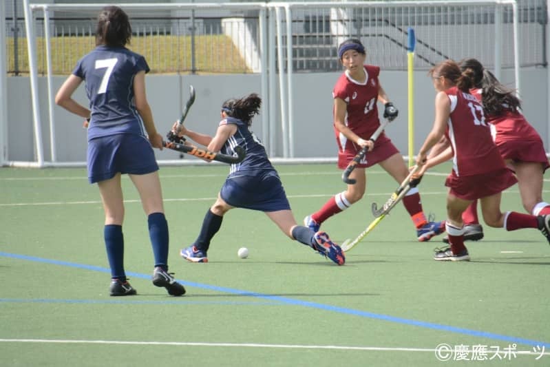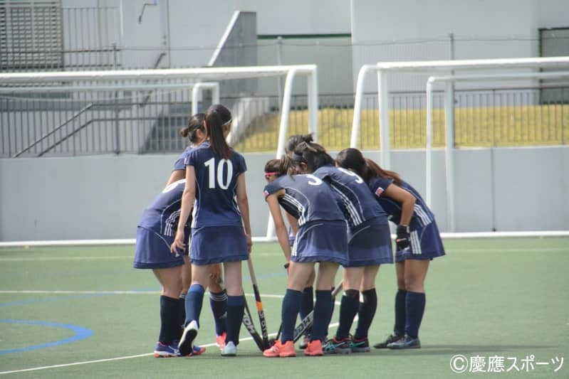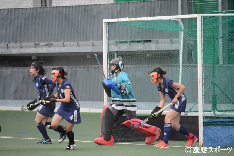 秋季リーグここまで1勝1敗としている慶大。勝てばプール2位となり準決勝進出、負ければ上位進出が潰える大一番に臨んだ。試合は前半から早大ペースで進む。押される展開となった慶大はPC(ペナルティコーナー)などから多くのピンチを迎えるが、GK飯塚美里(政4・慶應女子)がビッグセーブを連発し得点を許さない。しかし最終第4Q、相手にPS(ペナルティストローク)を冷静に決められ先制点を許してしまう。上位進出には勝利しかない慶大はGKを下げ、パワープレーを仕掛ける。終了間際、FW西村未八(政3・慶應NY)が同点ゴールを奪ったがあと1点は遠く。引き分けに終わり、得失点差でAプール3位に。5~8位決定戦に回ることとなった。