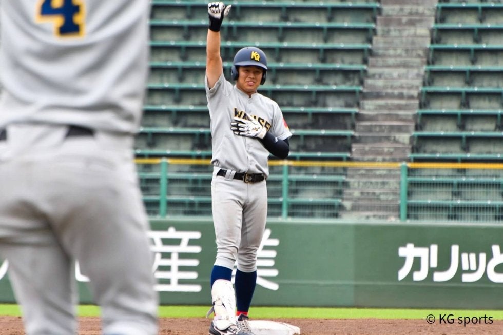 <写真・二塁上で笑顔の中隈>10月16日、ほっともっとフィールド神戸にて令和3年度関西学生野球連盟秋季リーグ戦第6節対近…