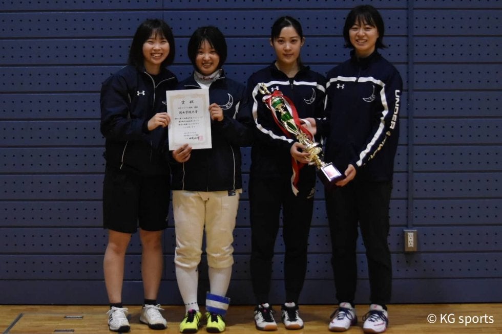 <写真・女子フルーレ団体で優勝を果たした選手たち〉 10月16日、京都府大山崎町体育館にて、令和3年度関西学生フェンシン…
