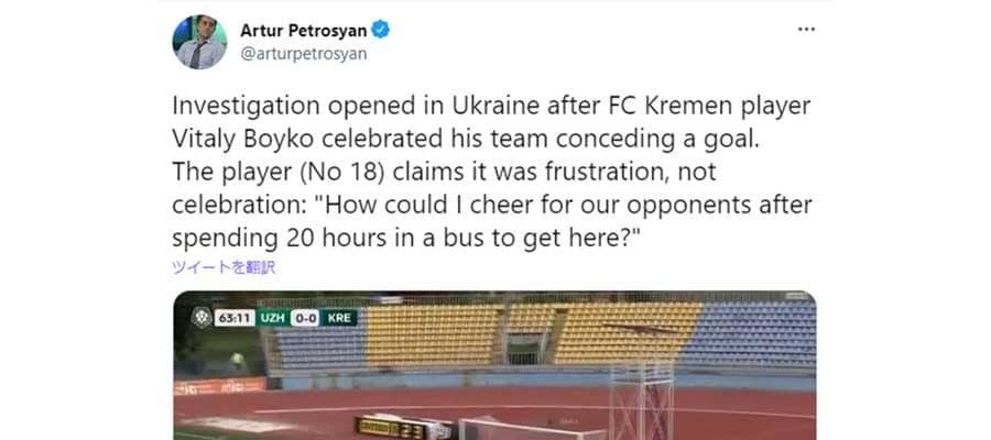 ウクライナでの出来事を海外記者が映像で公開 海外サッカーで、自チームの失点を喜ぶような仕草を見せた選手に疑惑の目が向けら…