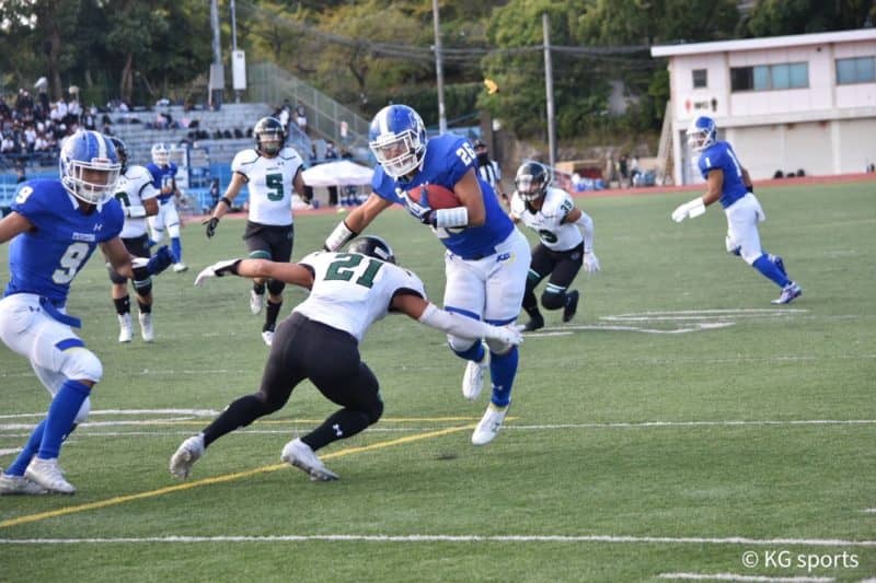 関学のオフェンスで試合開始。直後に#26RB前田(社4)が61ヤードを駆け抜けタッチダウン(TD)。#16K永田(法4)のポイントアフタータッチダウンも危なげなく成功し、関学に勢いを付けた。その後は#15QB鎌田(商2)から#1WR糸川(社3)へのパスを決め、着実に攻め込むも、TDまで持ち込むことはできず。#16K永田のフィールドゴールは成功し、3点を追加。その後も#27RB齋藤(総4)、再び#26前田がTDを決めるなどランプレーで得点を重ね31-0で前半を終える。第3Qは両校得点を許さない拮抗(きっこう)したプレーが続く。ディフェンスが粘りのプレーを見せた。最終Qは#55LB手塚(社4)が相手のパスをインターセプト。勢いそのまま#28RB池田(社2)が2TDを挙げ、実力を見せつけた。ディフェンスも相手に隙を与えず無失点で試合を終えた。 次戦は10月31日、春シーズンで敗北を喫した因縁の関大戦が行われる。