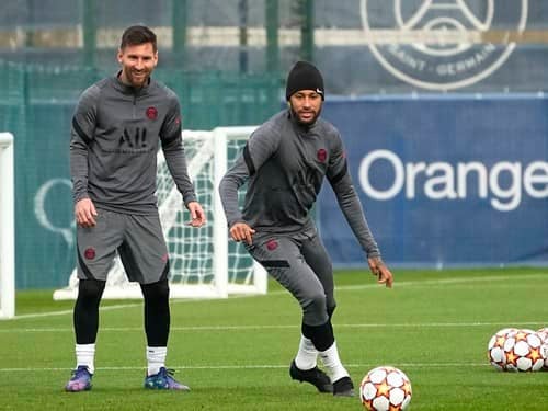 パリ・サンジェルマンでトレーニング中のネイマールとリオネル・メッシ photo by AP/AFLO