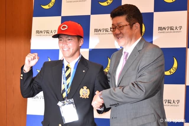 10月19日、関西学院会館にて先日、広島東洋カープからドラフト1位指名を受けた黒原拓未投手(社4)の指名挨拶が行われた。広島からは佐々岡真司監督らが出席し、それぞれ取材に応じた。