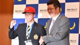 <写真・佐々岡監督と共に撮影に応じる黒原>10月19日、関西学院会館にて先日、広島東洋カープからドラフト1位指名を受けた…