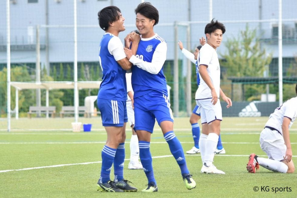 <写真・先制ゴール挙げ、笑顔を見せる濃野(中央)> 10月20日、J-GREEN堺・S9フィールドにて第99回関西学生サ…