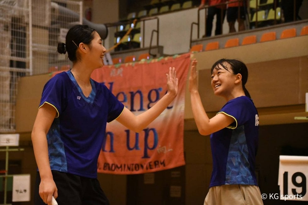 <写真・準々決勝で得点を決め喜び合う小野田・鎌田ペア〉 10月20日、ロートアリーナ奈良にて第72回全日本学生バドミント…