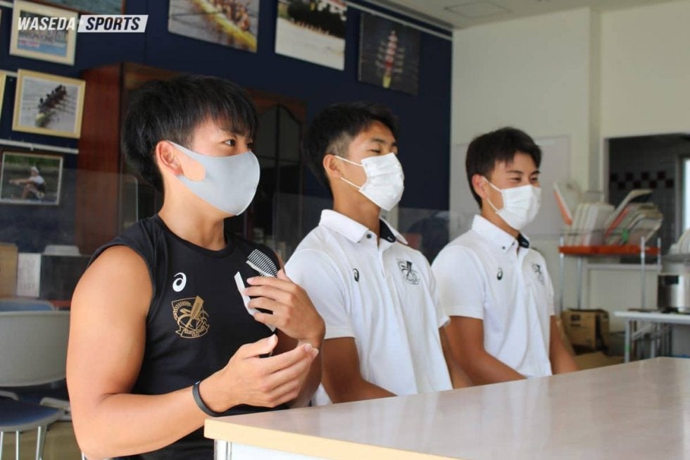 第2回に登場するは、男子エイトに出場する越智竣也(スポ3=愛媛・今治西)、小林里駆(スポ3=静岡・浜松西)、松並大智(基理1=静岡・沼津東)だ。B(バウ)、2番、3番のポジションを担う3選手は、これまで100日以上ともに練習してきたこともあり、抜群の連携をインタビューでも発揮してくださいました!