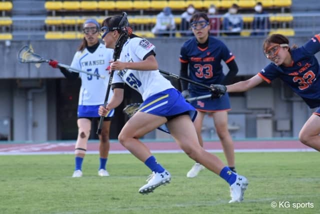 山之内風香主将(教4)「神大も目標に関西制覇を掲げているので、勢いに乗ってくると思っていた。初めての有観客試合、大きなスタジアムでの試合だったので緊張はしたが、アップから雰囲気をつくって試合に入れた。19得点は最多だと思う。自分たちのラクロスができたので大差になった。ただ、もう一度自分たちのプレーを分析し、みんなで一丸となりたい。同大戦までは『もっとできる』と思ってやり続け、大どんでん返しをしたい」