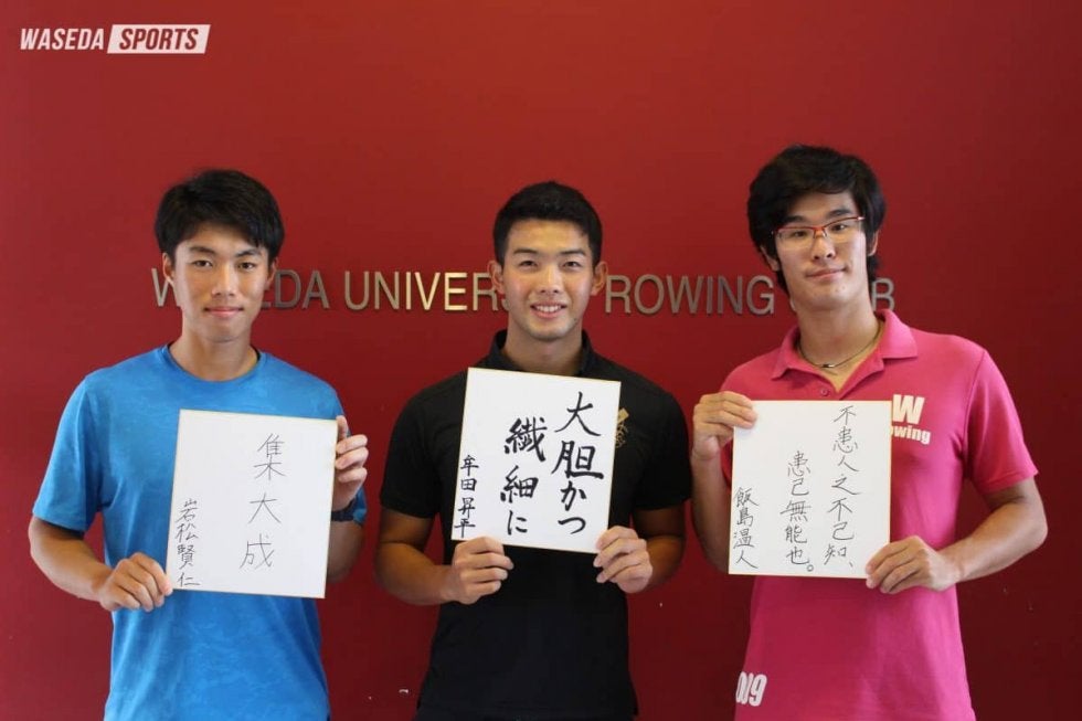 第3回に登場するは、今大会がラストレースとなる4年生3人だ。牟田昇平副将(商4=兵庫・三田学園)は舵手なしフォア、飯島温人(基理4=東京・早大学院)は舵手付きフォア、岩松賢仁(スポ4=熊本学園大付)は舵手なしペアに出場する。漕艇人生の締めくくりとなる今大会にかける想いや、これまでの三者三様の道のりを伺った。