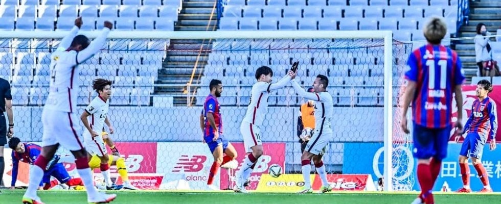 鹿島FW上田綺世のゴールを喜ぶ鹿島イレブンと落胆するFC東京イレブン 撮影:中地拓也