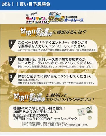 出演陣に勝利すれば、チャリカのキャッシュバック等、素敵な特典も!