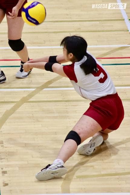 第1セットは課題としてきた滑り出しで、基本的なプレーの堅実さが光った。安定した返球から山下日和(社3=千葉・市船橋)のクイックにつなぎ、6−3とリードする。しかし、レシーブの乱れからネット際のボール処理で失点すると8−8と並ばれ、以降相手の勢いを止めることができなかった。この試合もレフトを厳しくマークされ、リベロの神戸彩有(文構2=長野・松本県ケ丘)がブロックカバーに身を投げ出すも及ばず。12−15の場面からは5連続得点を許し、19−25でセットを先取された。