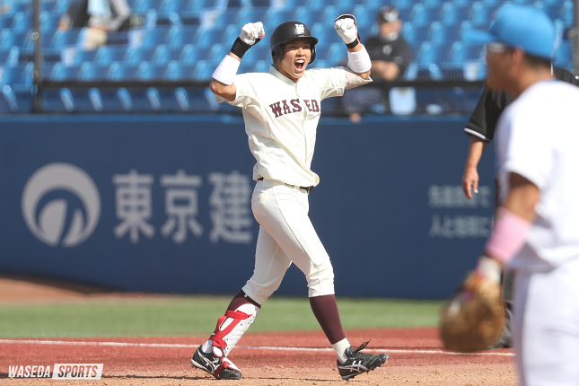 1年の時は下級生の仕事とか厳しいルールがあったことと、朝早く、夜は遅いので大変でした。2年で一番印象に残っているのはフレッシュの早慶戦で最後負けた時です。占部が学生コーチになるので選手として最後の試合でした。決勝で慶応に負けて、その時に自分や今井、橘内(俊治、教4=東京・早実)とかほかにもたくさんいましたが、最後4年になって早慶戦で勝って占部を胴上げしよう、と言って誓ったことが頭に残っていますね。3年は秋季リーグ戦での優勝も個人的にすごくうれしかったのですが、春は全然ダメだったというか、二軍の生活をしていて、その中でコロナの自粛もありました。自分的にはコロナ下での自粛期間がターニングポイントだったと思います。そこから這い上がりましたし、3年はそのような感じで上がって下がってを繰り返しました。でもやっぱり最後は上がるのだな、と思った一年でした。4年はこれからだと思っています。