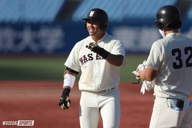 2000(平12)年9月8日生まれ。176センチ、87キロ。埼玉・浦和学院高出身。スポーツ科学部3年。早大野球部員からも「早慶戦で鍵を握る選手」との声が上がっているスラッガー。通算10本の本塁打は、慶大の正木選手と並んでリーグトップを誇ります。4年生のために、チームのためにと語る蛭間選手。好機での一打が楽しみです!
