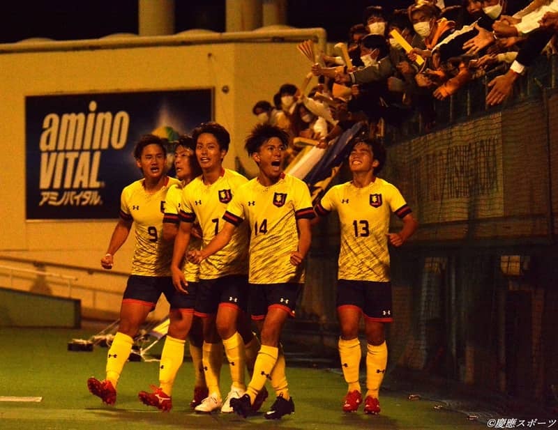得点直後、喜び合う選手たち合計4得点が生まれた前半とは打って変わって、後半は落ち着いた展開となる。両チームDF陣が奮闘し、なかなか決定機は生まれない。55分、慶大に最初のチャンスが生まれる。左サイドからのクロスに宮本稜大(商3・國學院久我山)が合わせるもキーパー正面。続く57分には橋本健人(総4・横浜F.C.ユース)が巧みなドリブルで持ち上がり北澤へパス。ペナルティエリア内に侵入したがシュートにはつながらない。徐々に慶大が攻勢を強める。しかし60分台に入ると徐々に早大の流れに。早大MF安斎颯馬(社1・青森山田)に攻め込まれ左足でのシュートを許したがここは前半から何度もマッチアップしている谷本竜一(総4・FCトリプレッタユース)がブロック。その後も慶大DF陣が粘りを見せる。87分、左サイドを駆け上がった橋本のクロスに山田大敬(総4・京都サンガF.CU-18)が合わせる。キーパーと1対1の決定機だったが惜しくもバーの上。逆転ゴールへの期待が高まる。