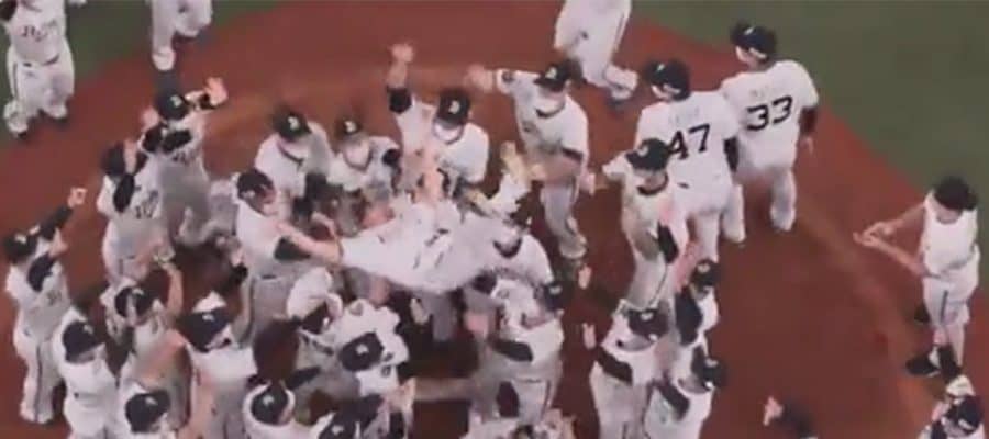 【実際の動画】25年ぶりに迎えた歓喜の瞬間! 中嶋監督が3度宙を舞うもファンは色々と心配のご様子…
