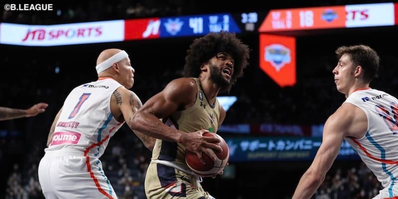続く10分間も依然琉球ペースで試合が進み、第2クォーター中盤、クーリーの得点で点差は20点に。前半終了時点で44-21と大きくリードした。