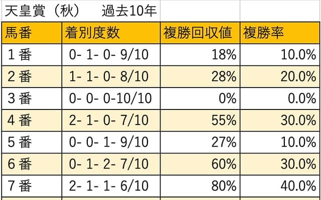 31日に東京競馬場で行われる天皇賞・秋(3歳上・GI・芝2000m)について枠順・馬番別に検証していく。 過去10年…