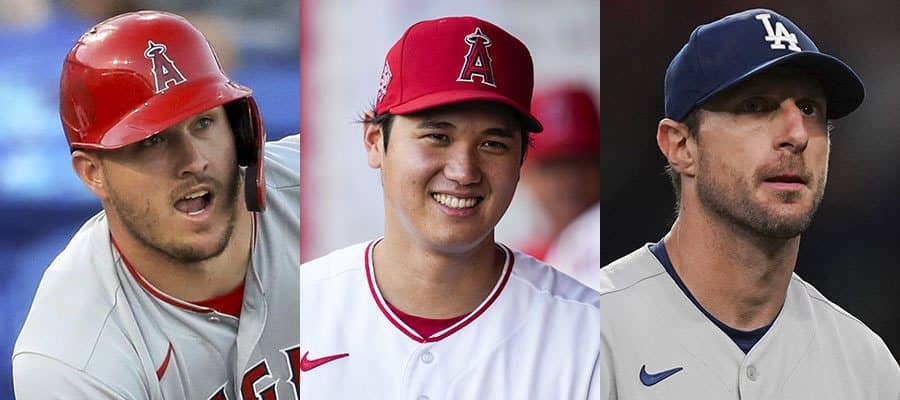 エンゼルスのマイク・トラウト、大谷翔平、ドジャースのマックス・シャーザー(左から)【写真:AP】