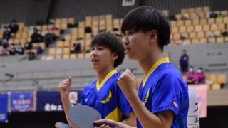 <写真・ガッツポーズを見せる天野・三浦ペア> 10月28日、所沢市民体育館にて第87回 全日本大学総合卓球選手権大会・…