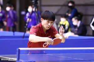 この日早大男子勢で唯一のフルゲームとなったのが、柏竹琉(スポ2=JOCエリートアカデミー)の2回戦。強豪・明大の川村大貴と熱戦を演じた。試合は第1、第2ゲームを連取され、いきなり相窮地に。しかし、ここで相手に流れを渡さなかった。チキータを使ったレシーブからラリーに持ち込む展開を得点源とし、2ゲーム差を挽回。迎えた最終ゲームは相手のマッチポイントを2度しのぎ、最後はドライブを打ち抜いた。フルゲーム11-11にもつれた大接戦を逆転で制し、渾身(こんしん)のガッツポーズを決めた。柏の他に、シードの川上と初戦を突破した岩永宜久(スポ3=福島・帝京安積)の2人が2回戦を危なげなく勝利し3回戦へ。ランク入り(ベスト8)まであと3勝。一戦一戦勝ち星を重ねたい。