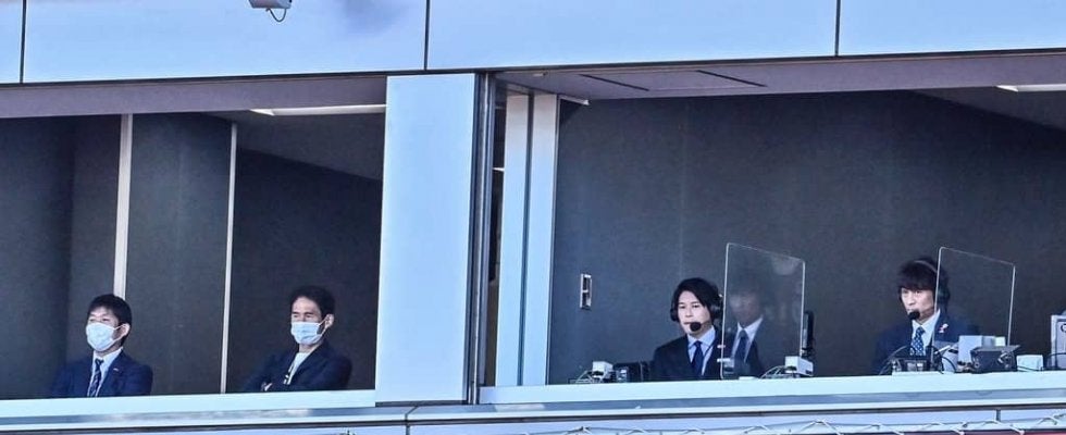 試合解説する内田篤人氏。左端は森保一監督で、内田氏の右隣は宮本恒靖氏 撮影:中地拓也