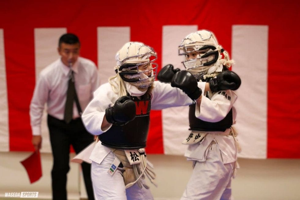 開会式が終わり、本戦の前にエキシビションマッチとして女子の試合が行われた。早大からは2年の松井が出場し、慶大2年の野中と対戦。松井は試合序盤からアグレッシブに攻め続け、1分15秒に面突きで一本を奪った。その後も終始危なげない試合運びでこの一本を守り抜き勝利。チームとして幸先の良いスタートとなった。