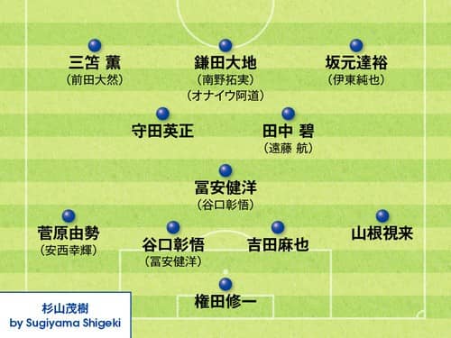 FW/三笘薫(前田大然)、鎌田大地(南野拓実、オナイウ阿道)、坂元達裕(伊東純也)